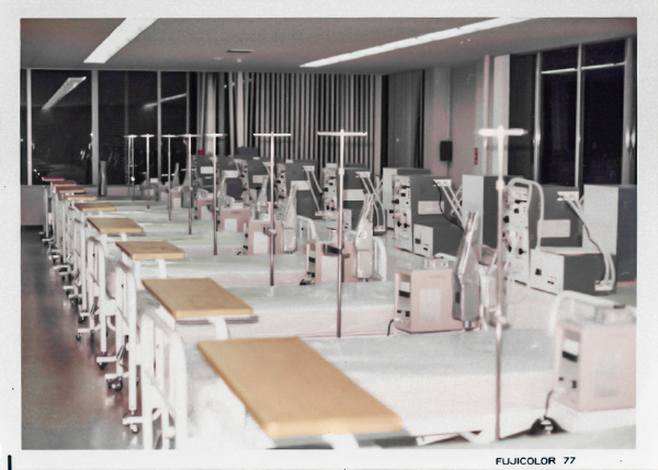 幸町会館3階から5階に診療所を構えていた当時、透析ベッドは約50床。すべて同じ方向にベッドが配置されており、シャントの左右によって臥床する向きが決められていたようです。週2回透析から、週3回透析が主流となる頃でもありました。入院病床は20床ほどで、大部屋は8人部屋。プライバシーを守るカーテンも、まだ設置されていなかった時代です。